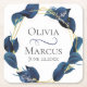 Party Untersetzer | Moderne Kalligraphie mit Deep Indigo Blue Leafy Foliage umgibt einen goldenen, facettenreichen Rahmen - Glitzern strahlen auf den Blätter. Braut und Gräuel mit Hochzeitstermin. Design erstellt für TheBarefootBride™ durch © WhimsicalArtwork™. Das ist Teil einer Sammlung von Hochzeitsartikeln mit passendem Hochzeitszubehör, Babydusche und anderen Veranstaltungsartikeln. Kontaktieren Sie uns, wenn Sie Hilfe benötigen.