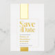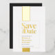 Ein wunderschöner Schriftart aus Goldfolie aus Serifen zeigt die Namen zukünftiger Neuvermählter und das Datum der Hochzeit, mit Worten in einem Kontrast alle Hauptstädte sauberen Schriftart in einem modernen geometrischen Rahmen in diesem minimalistischen typografischen Stil Hochzeit Save The Date. Die Rückseite der Karte weist eine solide dunkelgraue Farbe auf und kann mit den Monogrammen der Braut und des Bräutigams in einem schönen weißen Schriftart angepasst werden.