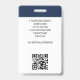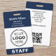 Erstellen Sie ein berufliches Erscheinungsbild mit diesem Abzeichen zur Mitarbeiteridentifizierung. Eine einfache und stilvolle Vorlage, die mit Ihrem Firmenlogo, Namen, Jobtitel, Standort und Mitarbeiternummer personalisiert ist. Kontaktinformationen liegen auf der Rückseite, ein QR-Code und weitere Informationen. Druckfarben: sehr dunkelblau, grau und weiß. Vertikales Format