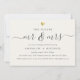 Diese minimale Einladung glänzt durch ihre Einfachheit. Eine schöne Schrift mit Schnörkeln lautet "The Future Mr. and Mrs." neben Ihren persönlichen Feierlichkeiten Details in der modernen Typografie. Oben sitzt ein zartes Imitat goldenes Herz.