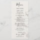 A wedding reception menu featuring a modern motif of a white rose on a ivory-colored background, complete with meal course selections, dessert and detailed descriptions.