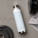 Moderne Light Dusty Blue Gold Script Monogram Water Flasche. Modernes, elegantes Monogramm-Design mit handgeschriebener, minimalistischer Schrifttyp-Schrift und serifenloser Blocktypografie auf elegantem pastellfarbenen Hintergrund Light Dusty Blue. Das Monogramm und der Name können leicht personalisiert werden.