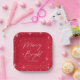 Modern holiday paper plates featuring "Merry and Bright" displayed in a hand-lettered script surrounded by a border of white stars against a red background. Personalize the merry and bright paper plates with your family name or custom text below. The festive paper plates are perfect to use for holiday parties, Christmas dinners, and other holiday events.