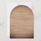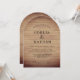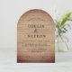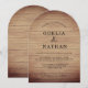 rustic wedding invitation features a trendy arch-shaped design with a warm, natural wood grain background. It perfectly combines elegant serif typography with a cozy, country-chic aesthetic for a modern outdoor wedding.