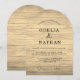 rustic wedding invitation features a trendy arch-shaped design with a warm, natural wood grain background. It perfectly combines elegant serif typography with a cozy, country-chic aesthetic for a modern outdoor wedding.