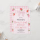 Berry first birthday invitation template for girl featuring various strawberries and white daisies on a pink gingham pattern background and arch. This berry first birthday invitation also features a pink bow, heart font heading and is ideal for a girls berry themed first birthday party.