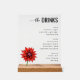 This elegant wedding menu card features a minimalist layout with a clean white background, highlighting the stylish mix of cursive and bold sans-serif typography for "the DRINKS." The design is divided into three sections—Beer, Wine, and Spirits—each listing options in simple, readable text. A vibrant red flower illustration adds a touch of color and artistic flair to the otherwise monochrome palette, creating a modern and sophisticated aesthetic perfect for presenting beverage choices at your special event.