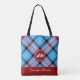 Moderne Red Wax Monogram Script Name Kariert Tartan Tote Bag Stilvolle, elegante und gürtelbare Tote Tasche mit "personalisiertem Monogramm" auf einem roten Wachs Siegel, "personalisierter Name" auf einem roten Streifen unten, und Baby rosa / blau kariert tartan Hintergrund. Personalisieren Sie diese schöne Tasche als ein wunderbares Geschenk für eine Braut, Brautjungfrau, Lehrerin, Freundin oder ein Mitglied Ihrer Familie, indem Sie Ihren Namen oder Text / ändern Sie den Schriftart, Farbe, Größe und Position.