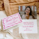 Zeigen Sie Ihre Wertschätzung mit diesem modernen rosa Rahmen Abschluss danke Ihnen Karte. Mit "Danke" in elegantem, handgeschriebenem, rosa Drehbuch, wird dieses Design durch eine stilvolle rosa, gewellte Grenze vor einem hellrosa Hintergrund betont. Passen Sie die Vorderseite mit Ihrem Namen und Abschluss Jahr für eine persönliche Touch. Im Inneren zeigen Sie oben Ihr horizontales Senior-Foto, unten mit fett rosa Buchstaben Ihre herzliche Botschaft. Dieses personalisierte Dankeschön-Kartenspiel eignet sich perfekt für Absolventen der Highschool und der Uni und verleiht Ihrem Abschluss eine bezaubernde und unvergessliche Touch.