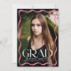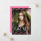 Feiern Sie Ihren Gymnasialabsolventen mit dieser eleganten Ankündigung eines Abschlusses mit einem voll bluten, senkrechten Foto, das durch eine stilvolle rosa Wavy-Grenze gerahmt ist. "Grad" wird in fett weißer Schrift dargestellt, um eine Aussage zu machen, während der Name des Absolventen, der Schule, und das Klassenjahr eine persönliche Touch hinzufügen. Das hintere Foto bietet Platz für eine individuelle Botschaft und ist somit der ideale Ort, um diesen Meilenstein mit Freunden und Familie zu teilen.
