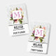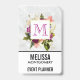 Namensschild mit hübschem Aquarelldesign. Eine Blumenstruktur mit vielen verschiedenen Blume in Rot-, Rosa- und Weißtönen und viel grünem Blattwerk. Ein überlagerter Rahmen mit einem Imitat-vergoldeten Rahmen. Elegantes Design. Hintergrund aus weißem Marmor.