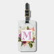 Ein Gepäckanhänger personalisiert mit einem Single Monogramm Brief auf der Vorderseite und Ihre persönlichen Informationen auf der Rückseite. Entworfen mit einem hübschen Aquarelldesign. Eine Blumenstruktur mit vielen verschiedenen Blume in Rot-, Rosa- und Weißtönen und viel grünem Blattwerk. Ein überlagerter Rahmen mit einem Imitat-vergoldeten Rahmen. Elegantes Design. Hintergrund aus weißem Marmor.