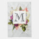 Küchenhandtuch mit hübschem Aquarelldesign. Eine Blumenstruktur mit vielen verschiedenen Blume in Rot-, Rosa- und Weißtönen und viel grünem Blattwerk. Ein überlagerter Rahmen mit einem Imitat-vergoldeten Rahmen. Elegantes Design. Hintergrund aus weißem Marmor.