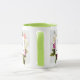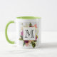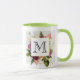 Kaffee Tasse mit hübschem Aquarell-Design. Eine Blumenstruktur mit vielen verschiedenen Blume in Rot-, Rosa- und Weißtönen und viel grünem Blattwerk. Ein überlagerter Rahmen mit einem Imitat-vergoldeten Rahmen. Elegantes Design. Hintergrund aus weißem Marmor. Personalisieren Sie diese mit einem Monogramm-Buchstaben.