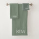 Modern green monogram towel set featuring crisp white initials with a botanical motif placed between the letters. The rich tone reads like sage green for a calm spa feel, while the white typography keeps the look clean and minimalist. Perfect for modern bathrooms, guest spaces, and gifting for housewarmings or weddings, this design brings a refined natural touch to everyday routines.