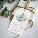 Personalized Christmas gift tags feature watercolor pine tree and elegant Merriest Christmas script in sage green, modern and simple. Custom your own family name.