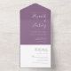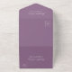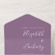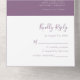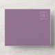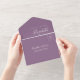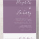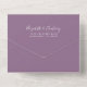 Diese einfache, moderne und alleinerziehende Hochzeitseinladung mit weißem Text auf mauvem Hintergrund. Fügen Sie die Namen der Braut und Bräutigam in stilvoller Handschrift Kalligraphie und die Details in sans serif Schriftart. Die abnehmbare UAWG ist lila auf weißem Hintergrund. Fügen Sie Ihre Rücksendeadresse in Weiß auf der lila Außenklappe und auf der Rückseite der UAWG.