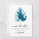 Moderne Hochzeiten speichern das Design der Dattelkarte mit Aquarellmonstera-Blatt-Illustration auf einem einfachen weißen Hintergrund. Die Rückseite der Einladung ist in tiefblauer Farbe.
