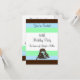 Ein elegantes Design mit einem modernen Kuchen in Schokolade und Blau mit Bändern und kaskadierenden Blume. Streifen in Schokolade, blau und grün Akzente auf der oberen und unteren Ebene der Einladung. Passen Sie das Alter an, indem Sie das passende Alter ändern und alle Party-Informationen nach Belieben hinzufügen.