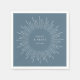 Moderner hellblauer Sonnenburstrahmen, schieferblaue personalisierte Papierservietten. Vorlage stellt zwei Leerzeichen für Namen und Ereignisdatum bereit.