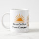 "First Coffee, Then Conquer." Minimalist mug with a rising sun. Pastel background, sans-serif typography. Perfect for coffee lovers, office, or as a thoughtful gift.
