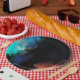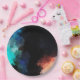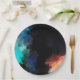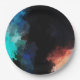 Papier Teller mit einem modernen abstrakten Design. Farbige Spritzer, türkisfarbene, weiße, orangefarbene und schwarze Farbtöne mit blauen Farbtupfern.