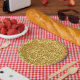 Modernes Retro-Kissen in einem halbabstrakten, allumfassenden Muster von Rose und Knospen - gemischte Medienkunst in Senfgold / Gelb und Weichbutter