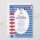 Moderne nautische Einladung mit einem roten & blauen Leuchtturm mit Anker & Anhänger Bunding Set auf blauem Streifen Hintergrund. Dreh unsere Segelfliege, um einen passenden Rücken für eine besondere Touch zu sehen. Ideal für eine nautische Babydusche zum Bootfahren für ein Mädchen, einen Jungen oder eine geschlechtsneutrale Dusche.