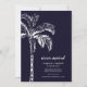 Tropisch bewegende Ankündigung mit einem Set aus Palmen auf schwarzblauem Hintergrund mit einem frischen und modernen Streifen hinten.
