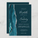 Der links Rand dieser eleganten, modernen Hochzeitseinladung zeichnet sich durch eine aquamarine blaue Aquarellgrenze aus, die mit Imitaten silbernen Glitzer bestickt ist. Der anpassbare Text kombiniert silbergraue Handschrift, Kupferplatte und kursiv Schriftart auf einem dunklen aquamarinen Hintergrund. Die Rückseite bietet Platz für Hochzeitsdetails auf einem soliden aquamarinen Hintergrund, zusammen mit einem QR-Code, den die Gäste scannen können, um Ihre Website und UAWG zu besuchen, was die Kosten für den Druck und Versand separater RSVP-Karten rette.