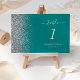 Die links Seite dieser eleganten, modernen Hochzeitsfeier-Tischnummer besticht durch das Design eines Glitzer in Silber-Imitat. Der anpassbare Text kombiniert silbergraue Handschrift, Kupferplatte und kursiv Schriftart auf einem aquamarinen blauen Hintergrund.