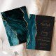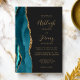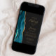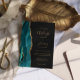 Der links Rand dieser eleganten, modernen Hochzeitseinladung zeichnet sich durch eine aquamarine Aquarellgrenze aus, die mit Imitaten mit goldenem Glitzer bestickt wurde. Der anpassbare Text kombiniert goldfarbene Handschrift, Copperplate und kursiv Schriftart auf dunkelkohlegrauem Hintergrund. Auf der Rückseite ist ein aquamarines und goldenes Design zu sehen.