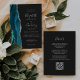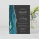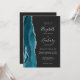 Der links Rand dieser eleganten, modernen Hochzeitseinladung zeichnet sich durch eine aquamarine blaue Aquarellgrenze aus, die mit Imitaten silbernen Glitzer bestickt ist. Der anpassbare Text kombiniert silbergraue Handschrift, Kupferplatte und kursiv Schriftart auf einem schwarzen Hintergrund. Die Rückseite bietet Platz für Hochzeitsdetails auf einem soliden, schwarzen Hintergrund, zusammen mit einem QR-Code, den die Gäste scannen können, um Ihre Website und UAWG zu besuchen, was die Kosten für den Druck und das Verschicken separater RSVP-Karten rette.