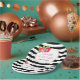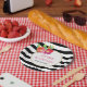 Moderne und schicke, blumengeschmückte Hochzeitspapiertafel mit schwarz-weiß gestreiften Mustern, einem weißen Kreis in der Mitte mit Ihrem Text und hübschen tropischen Blume in Rosa und lila. Es ist eine ideale Wahl für Ihre Hochzeit Brautparty oder Party Tisch.