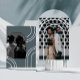 Diese moderne Hochzeitseinladung beinhaltet ein volles Foto mit einem gewölbten Typografie-Overlay. Die Rückseite ist ein hübsch staubblauer und weißer geometrischer Ausdruck mit einem bogenförmigen Foto.