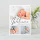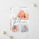 Eine einfache und elegante moderne Geburtsankündigung. Die Vorderseite zeigt eine 3-Foto-Collage Ihres Neugeborenen, überlagert mit "Welcome" in einem stilvollen Skript und dem Namen Ihres Babys, Geburtsdatum und Geburtsdaten in klassischer Serifentypografie. Fügen Sie auf der Rückseite 3 zusätzliche Fotos und Ihre personalisierte Nachricht hinzu.