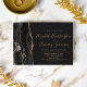 Die links Seite dieses eleganten, modernen Hochzeitseinladens besticht durch einen schwarzen Aquarellrahmen, der mit vergoldetem Imitat bestickt ist. Der anpassbare Text kombiniert goldfarbene Handschrift, Copperplate und kursiv Schriftart auf einem schwarzen Hintergrund. Auf der Rückseite ist ein passendes schwarz-goldfarbenes Agerat-Design zu sehen.
