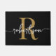 Girly Modern Elegant Stilvolle Schwarz-Gold Monogram Initial Family Name Script Custom Personalisiert Doormat. Dieses Design mit einem Familiennamen in einer hübschen Hand Schwanz-Schriftart-Kalligraphie (oder Typografie) mit Monogramm Initial in Gold und Weiß auf Schwarz. Große stilvolle feminine Hauswärmeschenke, auch zum Geburtstag, Hochzeit, Brautparty, Neuvermählte, Jubiläum, Junggeselinnen-Abschied und Es ist für das Mädchen, das schmiedet saubere minimalistische Dinge.