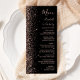 Die links Seite dieses eleganten, modernen Hochzeitsmenüs besticht durch das Design eines Glitzer in Rose mit vergoldeten Imitaten. Der individuell anpassbare Text kombiniert blassfarbene Handschrift, Copperplate und kursivste Schriftart auf schwarzem Hintergrund. Die Rückseite weist ein passendes Schwarz-Gold-Glitzer-Design auf.