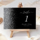 Die links Seite dieser eleganten, modernen Hochzeitsfeier-Tischnummer besticht durch das Design eines Glitzer in Silber-Imitat. Der anpassbare Text kombiniert silbergraue Handschrift, Kupferplatte und kursiv Schriftart auf schwarzem Hintergrund.