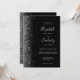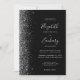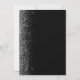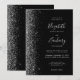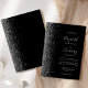 Die links Kulisse dieser modernen Hochzeitseinladung besticht durch ein silbernes Imitat-Glitzer-Design. Der anpassbare Text kombiniert silbergraue Handschrift, Kupferplatte und kursiv Schriftart auf schwarzem Hintergrund. Auf der Rückseite ist ein passendes Schwarz-Silber-Glitzer-Design erkennbar.