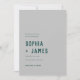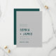 Moderne Save the Date Kartenvorlage in dunkelgrün und grau mit kräftiger, sauberer Typografie und einem Bohbogen auf der Kartenrückseite. Passen Sie diese Hochzeit an, speichern Sie die Date Card nach Ihren Wünschen, ändern Sie Textelemente und Farben, wenn Sie möchten.