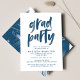 Einladende Gäste, um den Abitur mit unserer modernen Abschlussfeier lädt ein! Die trendy Graduierungsparty Einladungen zeigen "grad Party" in einem marinierten Pinsel Schriftart. Personalisieren Sie die kreative Graduiertenparty lädt ein, indem Sie den Namen des Absolventen, den Namen der Schule, das Abschluss Jahr und die Abschlussfeier Details hinzufügen. Die Einladung umgekehrt, um ein Marine-und weißen Pinselstrich Design anzuzeigen.