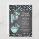 Moderne Kollektion der Braudusche mit rollendem Button, Mischschüssel, Spatel, Pizzabschneider, Whisk, Gemüseschäler und Messlöffel Set auf zeitgemäßem Chalkboard-Hintergrund mit aquamarinem Blau & Schwarz Polka Dot Confetti. Besuchen Sie unseren Shop, um diese Einladung in einer Vielzahl von beliebten Polterabend-Einladungen zu sehen.