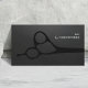 Moderne, elegante Visitenkartenvorlage mit einzigartiger Textur, dunkelgrauem Hintergrund und Schere. Perfekt für Haarstylisten, Friseursalons. Modernes Design.