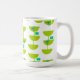 Diese Tasse hat ein modernes Design von grünen Halbkreisen, die wie Tassen zusammen mit türkisfarbenen Sternexplosionen und Rechtecken aussehen.
