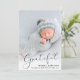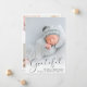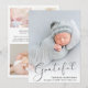 Eine moderne Karte, um die Geburt Ihres Babys anzukündigen, mit ihrem Foto überlagert mit "Grateful" geschrieben in einem eleganten Drehbuch mit einem Herzschlag. Fügen Sie unten ihren Namen, das Geburtsdatum und die Geburtsdaten hinzu. Fügen Sie auf der Rückseite drei zusätzliche Bilder und eine personalisierte Nachricht hinzu.