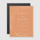 Einzigartiger Künstler erstellt moderne, einfache Blätter Orange Hochzeit speichern Sie das Datum Magnet, um Freunde und Familie daran zu erinnern, das Datum frei behalten. Schöne vereinfachende Eukalyptus-Blätter sprig, eine Grünanlage, die in einer schlichten, stilvollen Linienkunst zeichne, mit weißer, eleganter Typografie-Schrift auf einem peachy Terracotta apricot orange Hintergrund. Ein minimalistisches, stilvolles Blattdesign, das einfach mit der einfachen Vorlage personalisiert werden kann. Original-Kunstwerk von Catherine Sweetman
