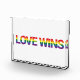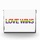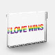 Modernes, farbenfrohes, lebendiges typografisches Design des Sprichworts "Liebe gewinnt" in Regenbogenfarben. Einfache, kühne, lebendige und urbane grafische Kunst.