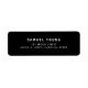 Moderne Rücksendeadressen-Aufkleber mit einem einfachen Design mit Ihrem Firmennamen in einem klassischen weißen Sans seif Schriftart und zwei Textzeilen für Ihre Rücksendeadresse in einem serifenlosen Sans-Schriftart, auf einem schwarzen Hintergrund. Diese minimalistischen Rücksendeadressen-Aufkleber haben ein schlichtes und einfaches Layout und fügen trotzdem eine berufliche Touch zu Ihren Umschlägen hinzu.